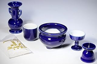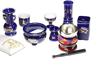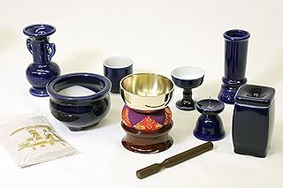 国産 仏具 セット ■ 瑠璃 ルリ ■ 陶器 5点+香炉灰 ■ ももたろうマッチ付 ■ モダン・ミニ仏壇に ■ お盆 お彼岸 お墓参り 供養