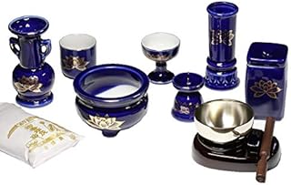 国産 仏具 セット ■ 瑠璃 ルリ 金蓮 ■ 陶器 7点+香炉灰+おりん 3点 ■ 線香差 マッチ消 ■ ももたろうマッチ付 ■ モダン・ミニ仏壇に ■ お盆 お彼岸 お墓参り 供養