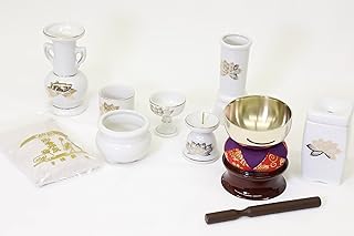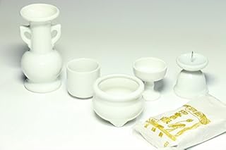 国産 仏具 セット ■ 白 金蓮 ■ 陶器 5点+香炉灰 ■ モダン・ミニ仏壇に ■ お盆 お彼岸 お墓参り 供養