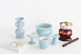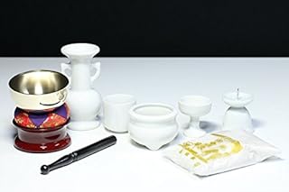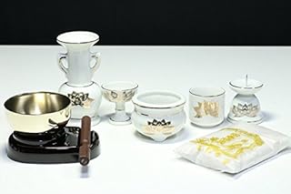 仏具は青磁金蓮となります。 花立、灯立て、茶湯器、仏飯器、香炉、線香差 マッチ消、香炉灰がセットとなっています。 このセットは、上置仏壇やミニ仏壇、白い仏壇にも良く合う美しい外観となっています。 サイズ約 (cm) ・おりん4点セット:高さ9.7 幅7.2 おりん径7.8 りん棒12.1 ・花立:高さ11 径5.6 重さ124g ・香炉:高さ6.9 径9.6 重さ214g ・灯立:高さ4.8 (針先まで6) 径4.4 重さ52g ・茶湯器:高さ5.1 径5.3 重さ64g ・仏飯器:高さ5.9 径5.2 重さ64g ・香炉灰:132g ・四角マッチ消:高さ8.8 径5.5 重さ176g ・線香差し:高さ11 径5.1 重さ102g 仏具は青磁金蓮となります。 花立、灯立て、茶湯器、仏飯器、香炉、香炉灰がセットとなっています。 このセットは、上置仏壇やミニ仏壇、白い仏壇にも良く合う美しい外観となっています。 職人さんの手造・手塗のため、画像や商品ごとの絵柄・形状・色合いが異なります事をご了承下さいませ。 サイズ約 (cm) ・花立:高さ11 径5.6 重さ124g ・香炉:高さ6.9 径9.6 重さ214g ・灯立:高さ4.8 (針先まで6) 径4.4 重さ52g ・茶湯器:高さ5.1 径5.3 重さ64g ・仏飯器:高さ5.9 径5.2 重さ64g ・香炉灰:132g 製造上、手作業の工程が多いため、すべての商品が完全に同じではなく、若干のサイズや色合いの違い、ごくわずかな小傷等が出る場合があります。 ご了承ください。