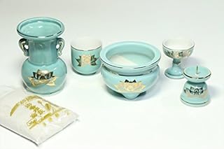 国産 仏具 セット ■ 青磁 金蓮 青地 ■ 陶器 5点+香炉灰 ■ モダン・ミニ仏壇に ■ お盆 お彼岸 お墓参り 供養