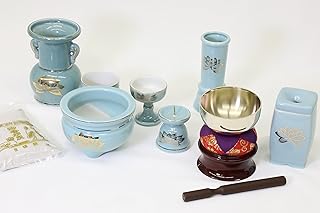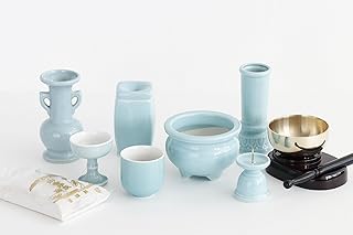 国産 仏具 セット ■ 青磁 青地 ■ 陶器 7点+香炉灰+おりん 3点 ■ 線香差 マッチ消 ■ モダン・ミニ仏壇に ■ お盆 お彼岸 お墓参り 供養