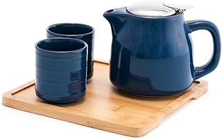 Happy Sales HSTS-T2DBU ティーセット 20オンス ティーポット 2カップと竹製トレイ ブルー