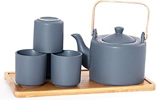 Happy Sales HSTS-KYTGRY セラミックティーポット ステンレススチールインフューザーと木製ハンドル付き 28液量オンス 4つのティーカップ 竹製サービングトレイ付き ティーセット グレー