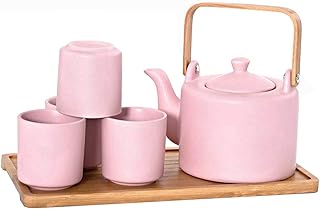 Happy Sales HSTS-KYTPNK セラミックティーポット ステンレススチールインフューザーと木製ハンドル 28液量オンス ティーカップ4つ 竹製サービングトレイティーセット ピンク