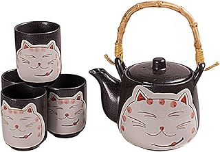 Happy Sales HSTS-FTCBLK 日本スタイル 幸運の猫 招き猫 磁器 ティーセット 茶こし付き ラタンハンドル ティーカップ4個 ブラック